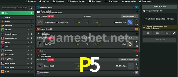 O P5 oferece uma grande seleção de opções de apostas em e-sports com probabilidades competitivas